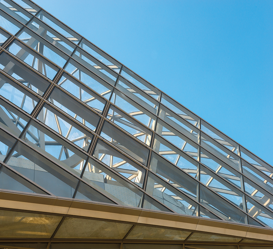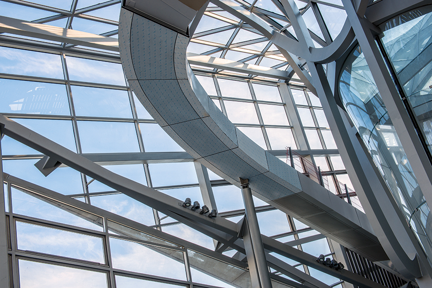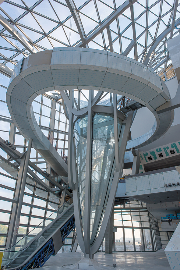 Die Sekundärkonstruktion wurde aus 31 Fassadenflächen errichtet, die aus 180 × 80 messenden Stahlprofilen und einem Raico-Fassadensystem mit einer Gesamtfläche von 6.000 m2 bestand.