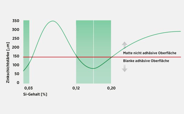 Auf reaktionsträgen Stählen mit geringem Siliziumgehalt (bis 0,03 %) aufgebrachte Feuerverzinkungsüberzüge zeichnen sich durch eine feine Struktur und eine gute mechanische Beständigkeit aus.