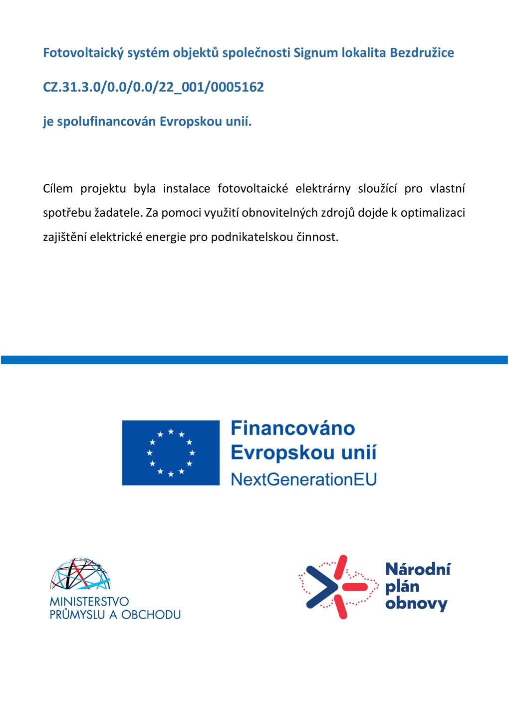 CZ.31.3.0/0.0/0.0/22_001/0005162 Fotovoltaický systém objektů společnosti Signum lokalita Bezdružice