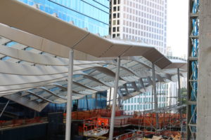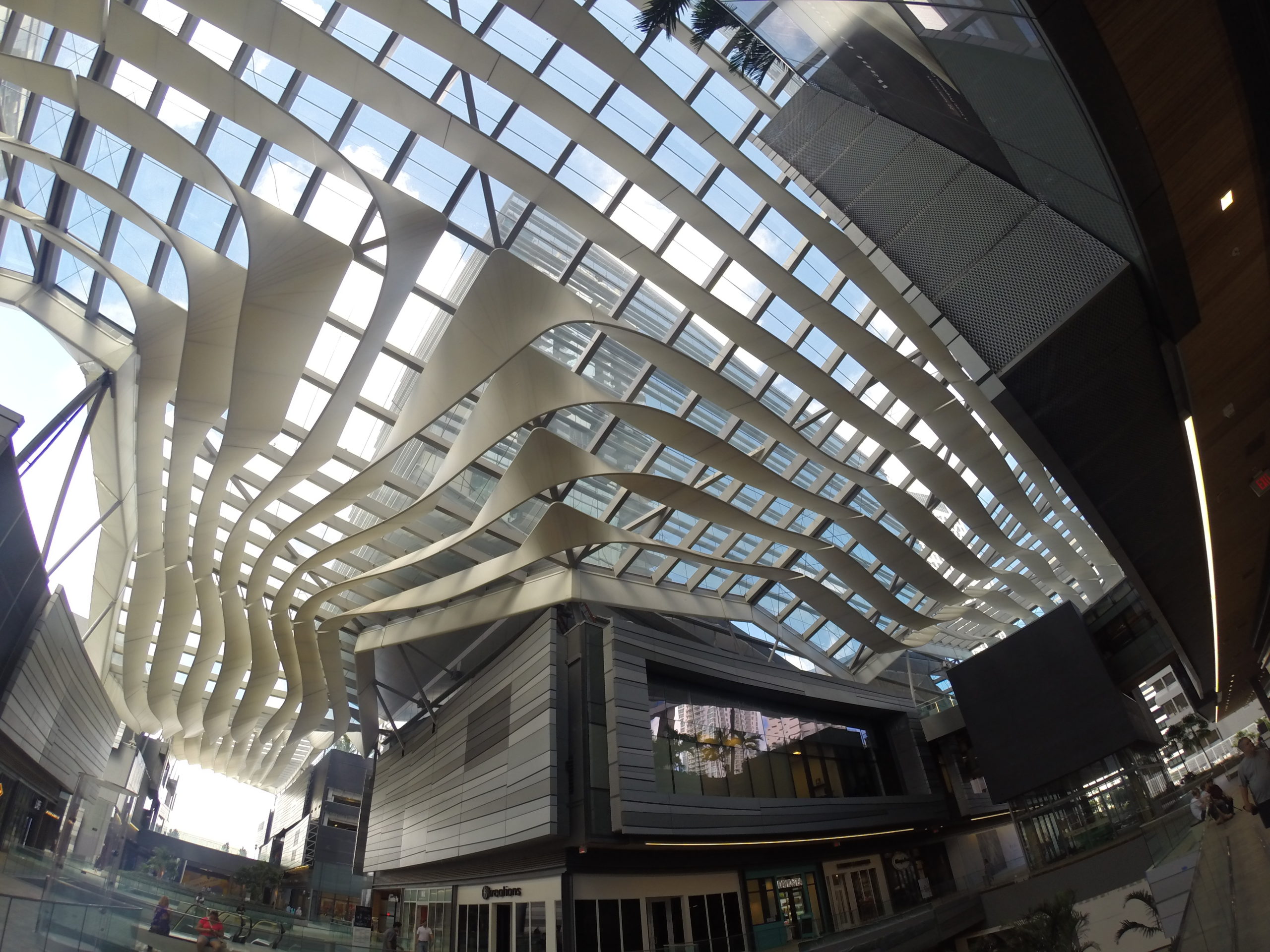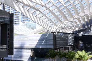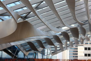 Obrovská konstrukce CLIMATE RIBBON chrání návštěvníky pasáže před nepřízní počasí a zároveň zachytává mořský vánek ze zálivu a stává se tak přirozenou klimatizací pro celé centrum.