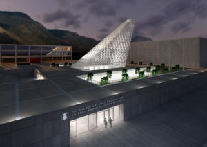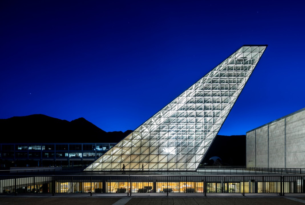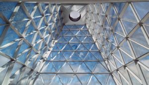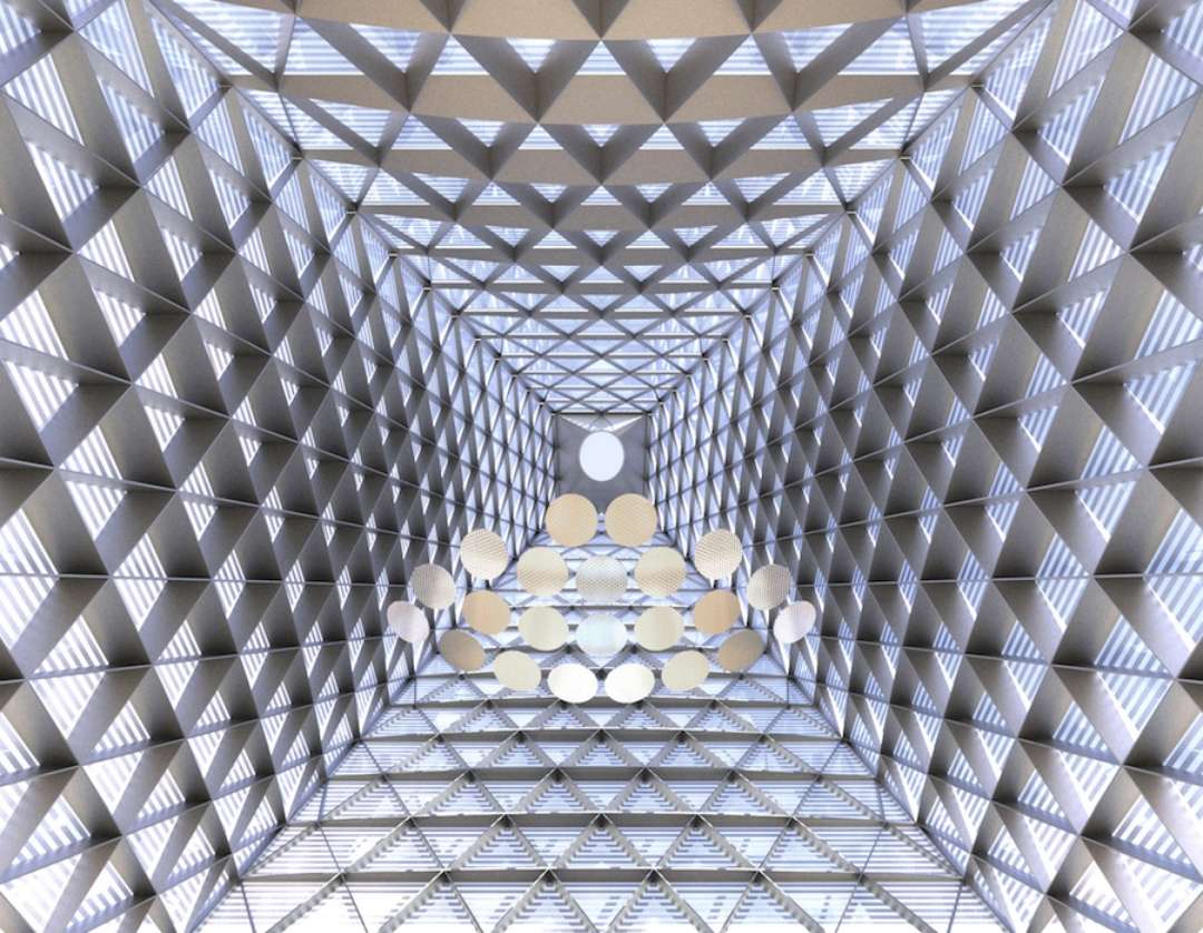 Vertikální ocelová konstrukce nese prosklenou pyramidu Polaris Hall v Coloradu